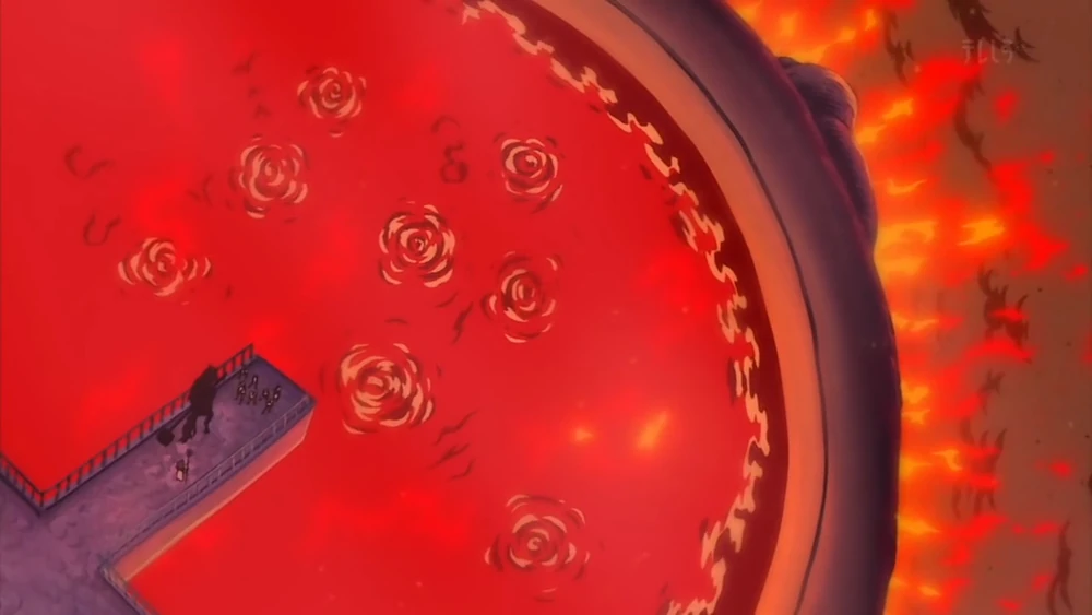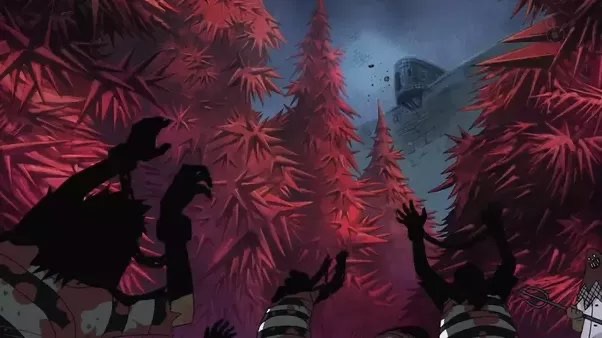 Nos adentramos en el primer nivel de Impel Down, en el que se encuentran los criminales de menor nivel. Se trata de un gran bosque cubierto de árboles con hojas cortantes como cuchillas y donde la hierba que cubre el suelo es tan afilada como millones de agujas. Los presos son perseguidos por arañas venenosas, mientras se desangran tiñendo este nivel del color rojo del que recibe su nombre.